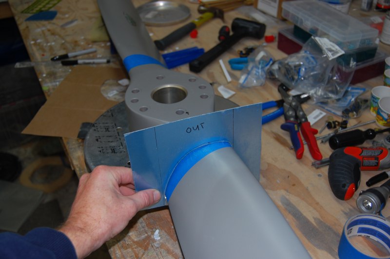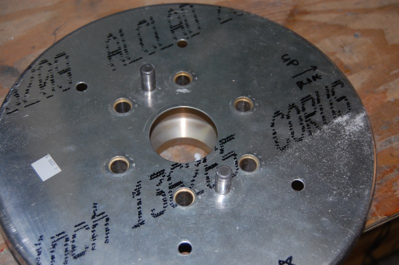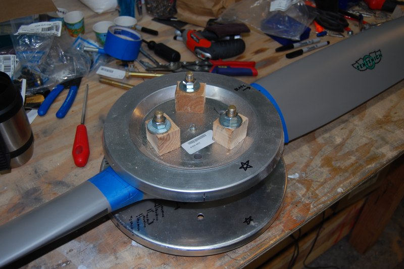 Anyway I made some temporary pins for alignment and a piece of plywood to hold the hold the back plate flat against the prop. (From Van's it's not perfectly flat from the punching and stamping process.)