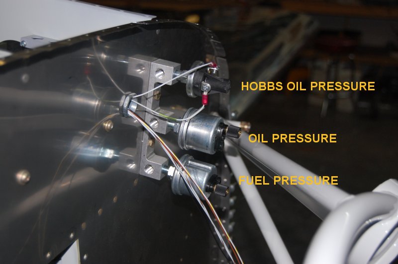 Temporarily screwed some more transducers into the transducer manifold. The hobbs oil pressure will actually be mounted next to the oil pressure when I get a 45deg fitting. I learned that the reason these are mounted on the firewall instead of directly on the engine is so they won't break off with all the vibration. A flexable line connects these to the engine so it can shake all it wants. Seems to make good sense since if one did break off, you'd have gas or all your oil shooting out of the hole.