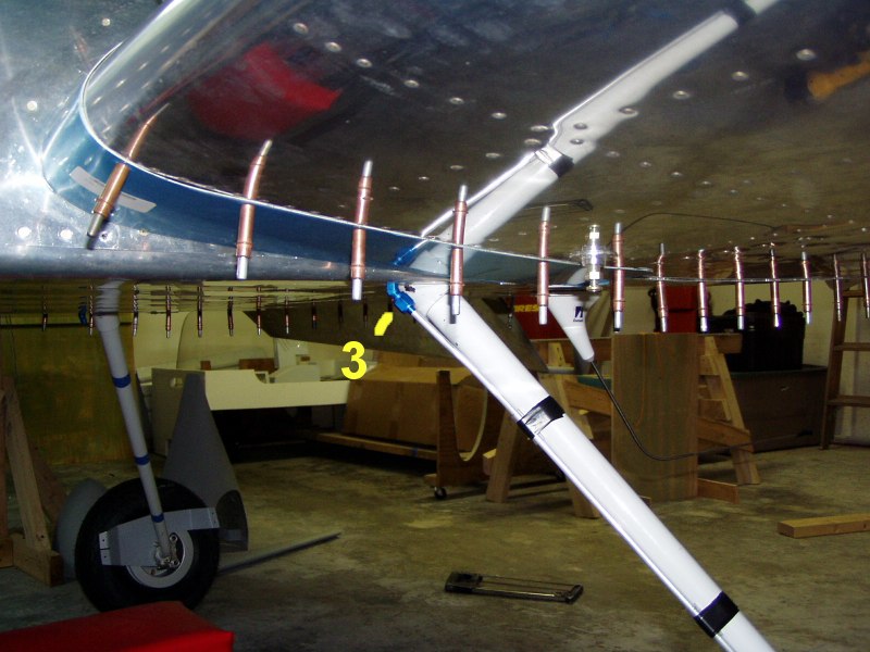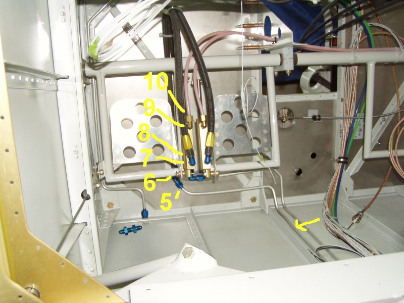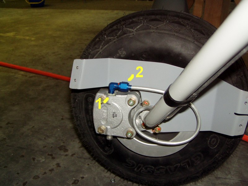 Here's what I'm talking about with the connections numbered. The brake line starts out at the caliper, wraps around and heads up the gear leg.